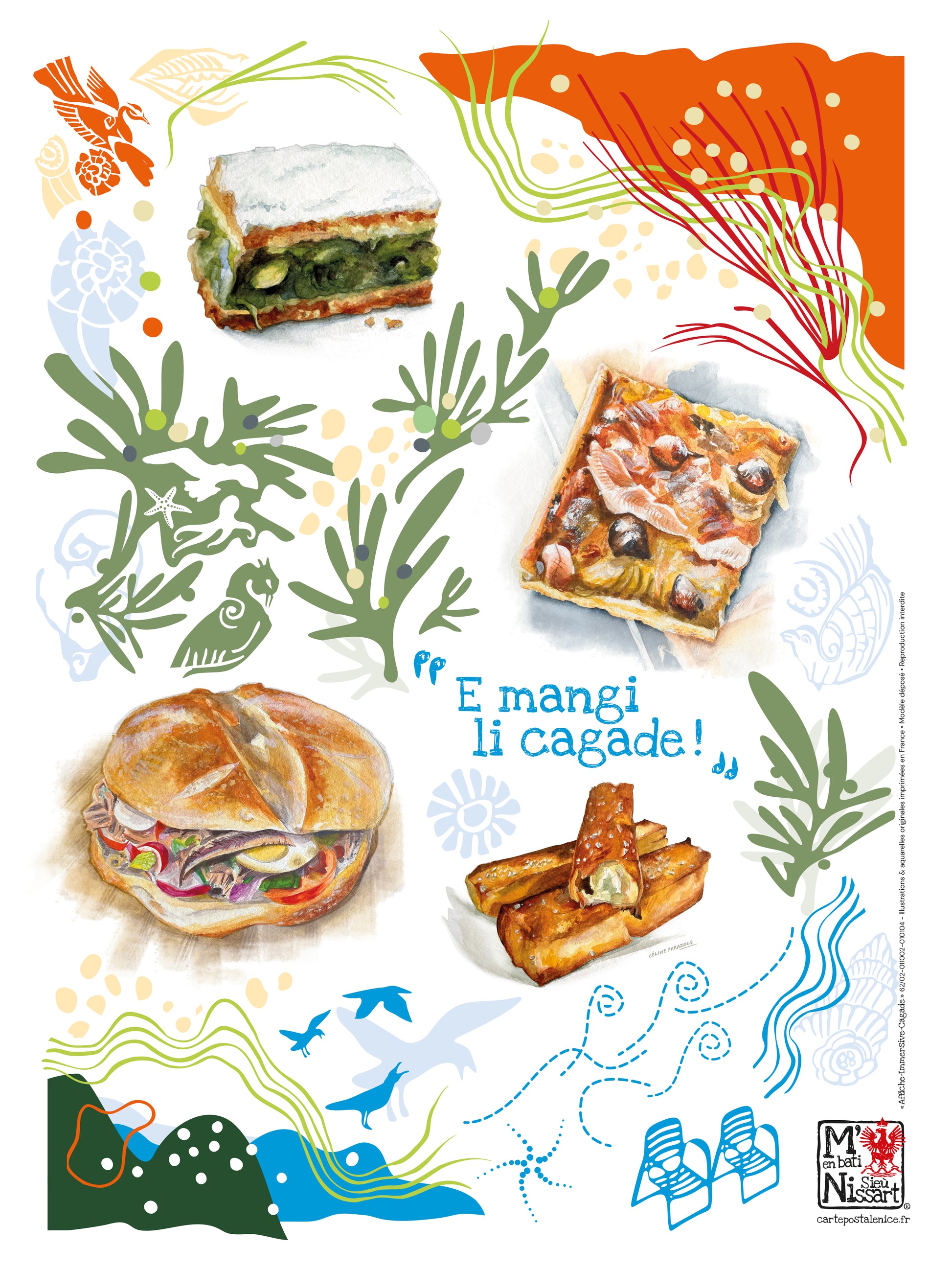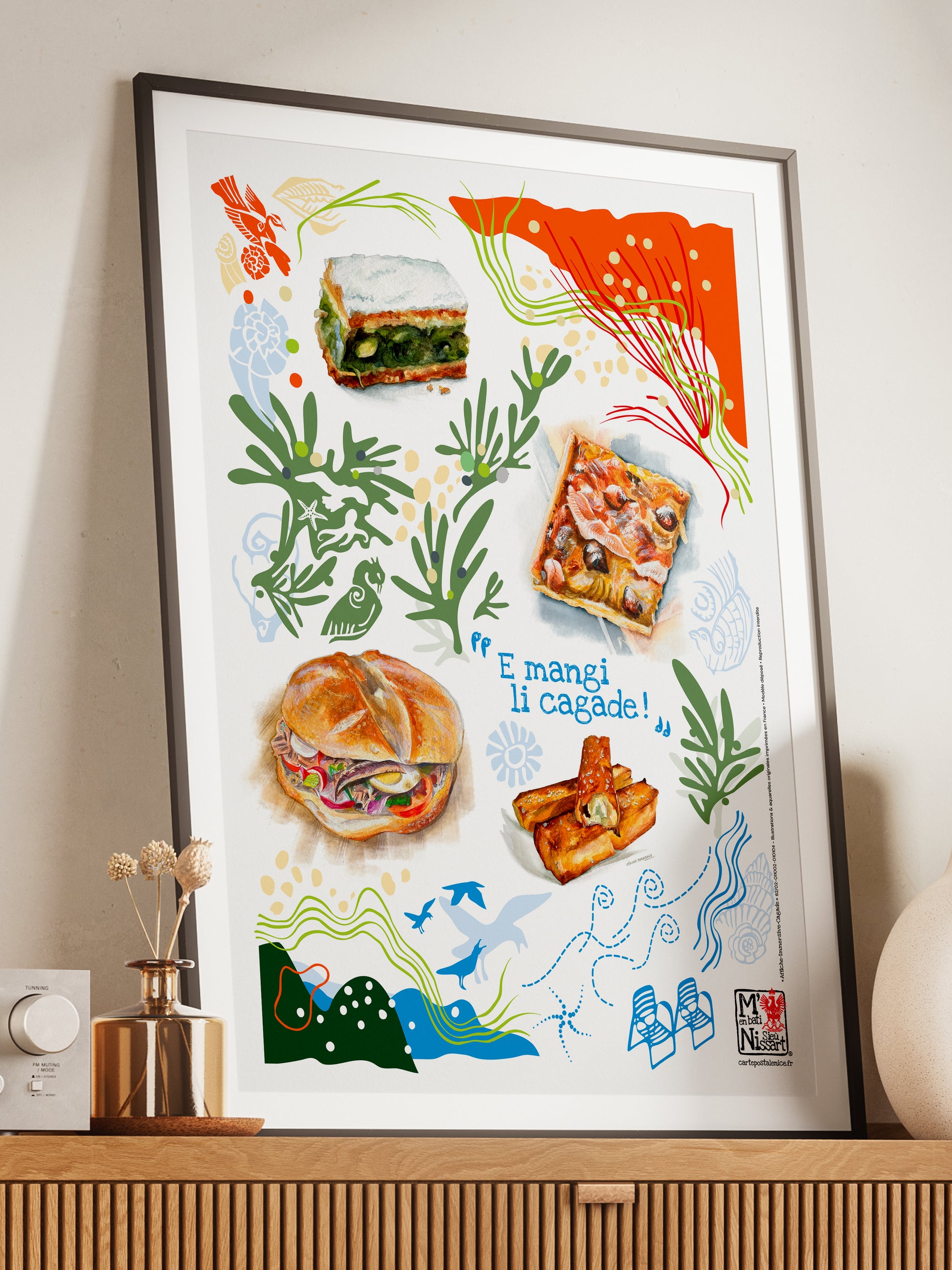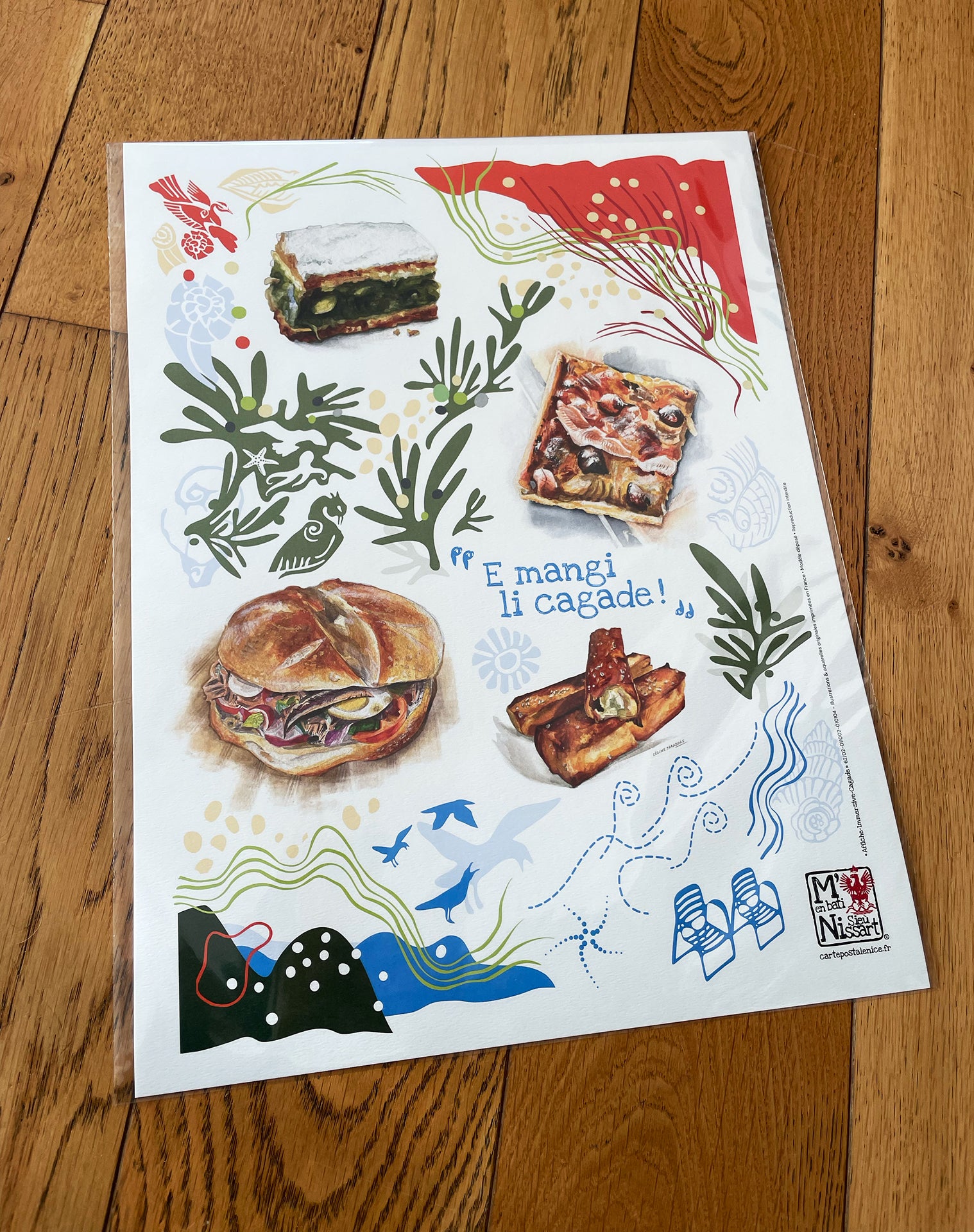 Affiche d’art niçois (format 30 x 40 cm, 250 g). Imprimée en France à Nice sur papier rives blanc texturé. L’esprit “M’en bati sieù Nissart®”, marque déposée, à offrir ou encadrer.