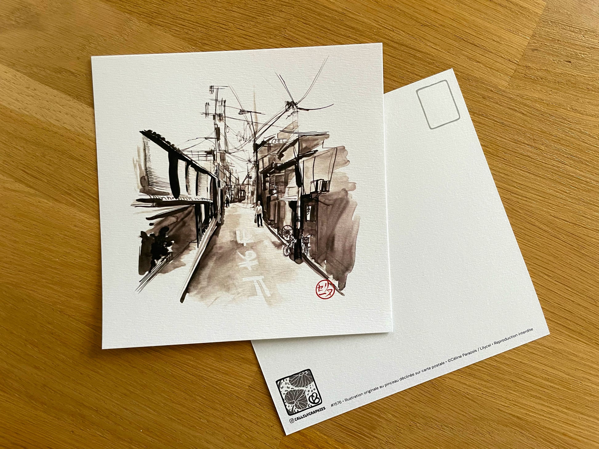 Carte postale imprimée en France à Nice sur papier rives blanc texturé au format 150 x 150 mm, 250 g. Esprit calligraphies d’un carnet de voyage au Japon. Une collection poétique à offrir ou à encadrer.