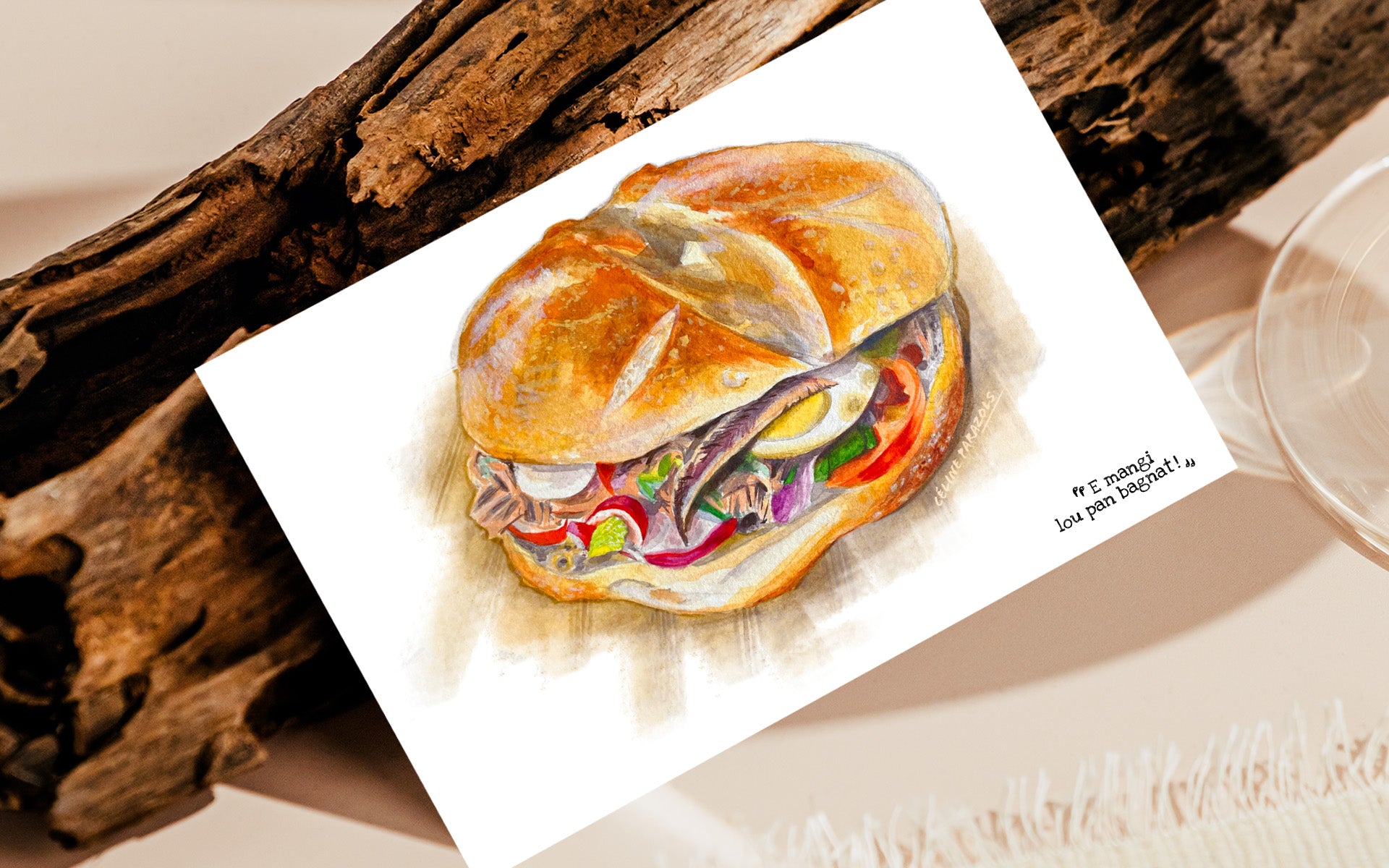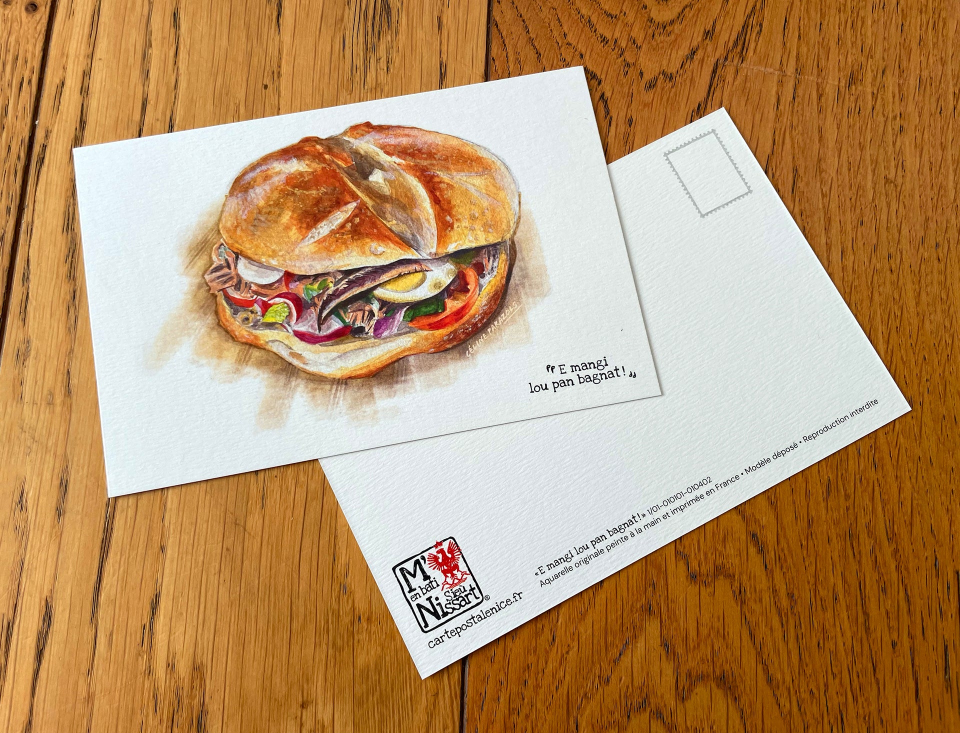 Carte postale d’art niçois, réalisée d’après une aquarelle originale. Imprimée en France à Nice sur papier rives blanc texturé au format 150 x 100 mm, 320 g. L’esprit “M’en Bati Sieù Nissart®”, marque déposée, à offrir ou encadrer.