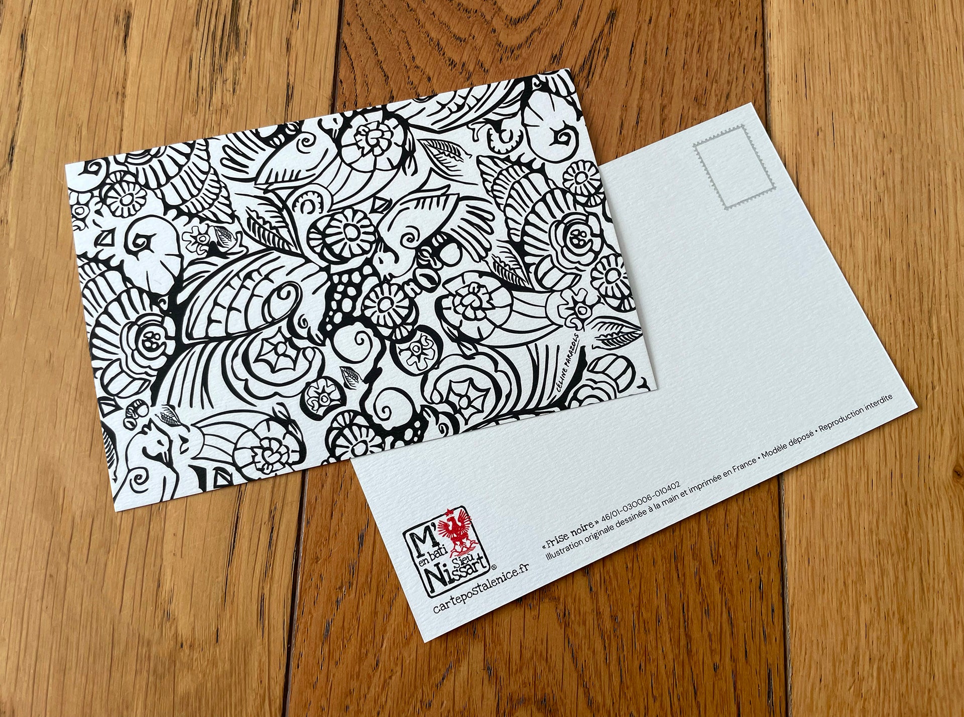 Carte postale d’art niçois — détails du patrimoine et quotidien — imprimée en France à Nice sur papier rives blanc texturé. Format rectangulaire 100 x 150 m, 320 g. L’esprit “M’en Bati Sieù Nissart®”, marque déposée, à offrir ou encadrer.