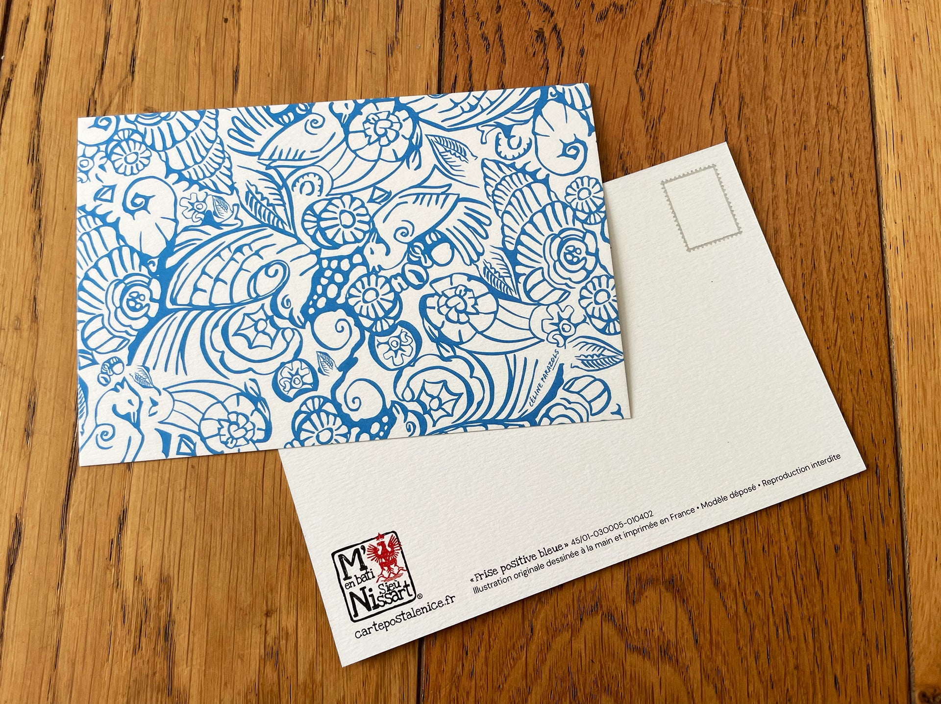 Carte postale d’art niçois — détails du patrimoine et quotidien — imprimée en France à Nice sur papier rives blanc texturé. Format rectangulaire 100 x 150 m, 320 g. L’esprit “M’en Bati Sieù Nissart®”, marque déposée, à offrir ou encadrer.
