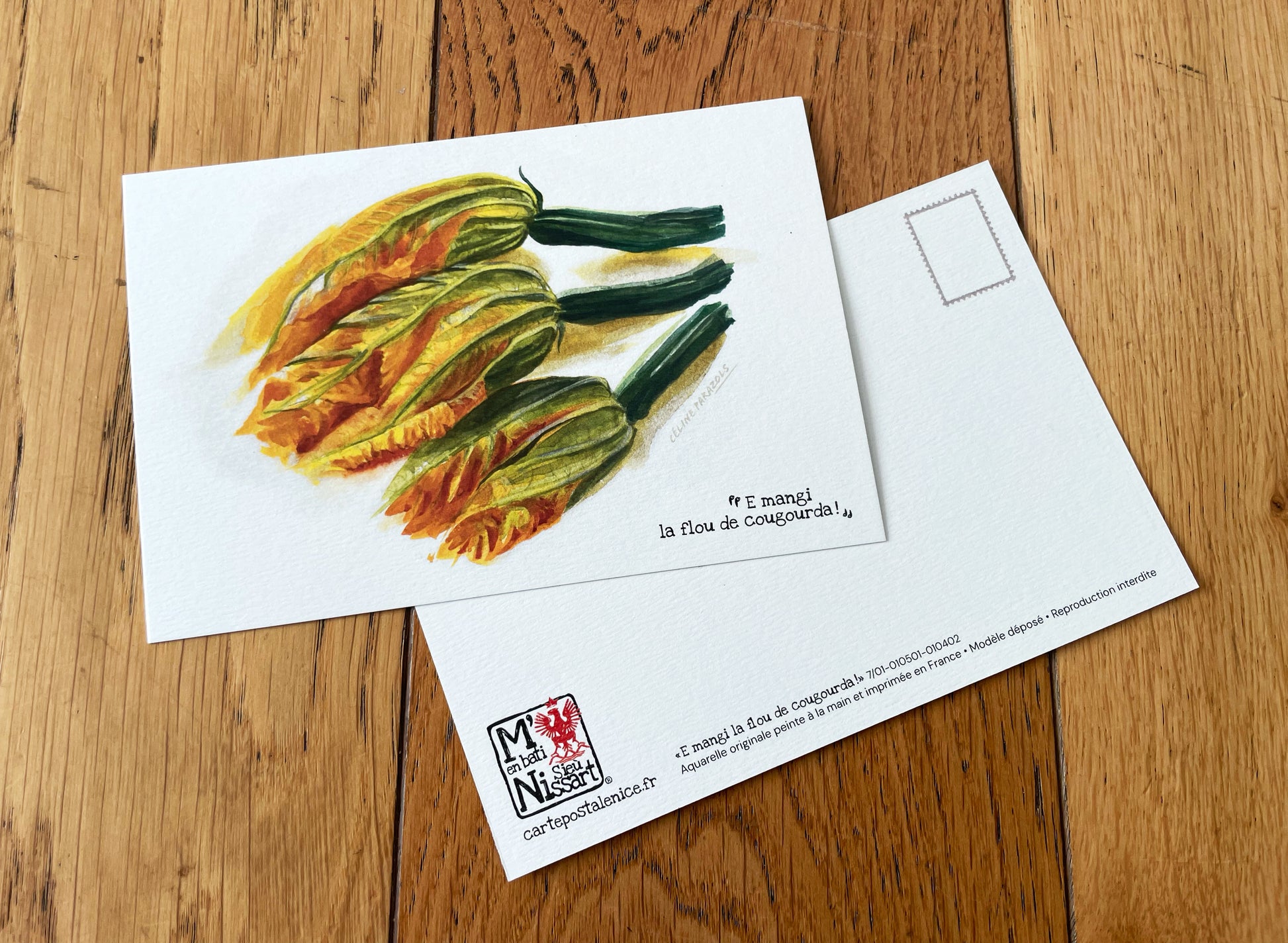 Carte postale d’art niçois, réalisée d’après une aquarelle originale. Imprimée en France à Nice sur papier rives blanc texturé. Format rectangulaire 100 x 150 m, 320 g. L’esprit “M’en Bati Sieù Nissart®”, marque déposée, à offrir ou encadrer.