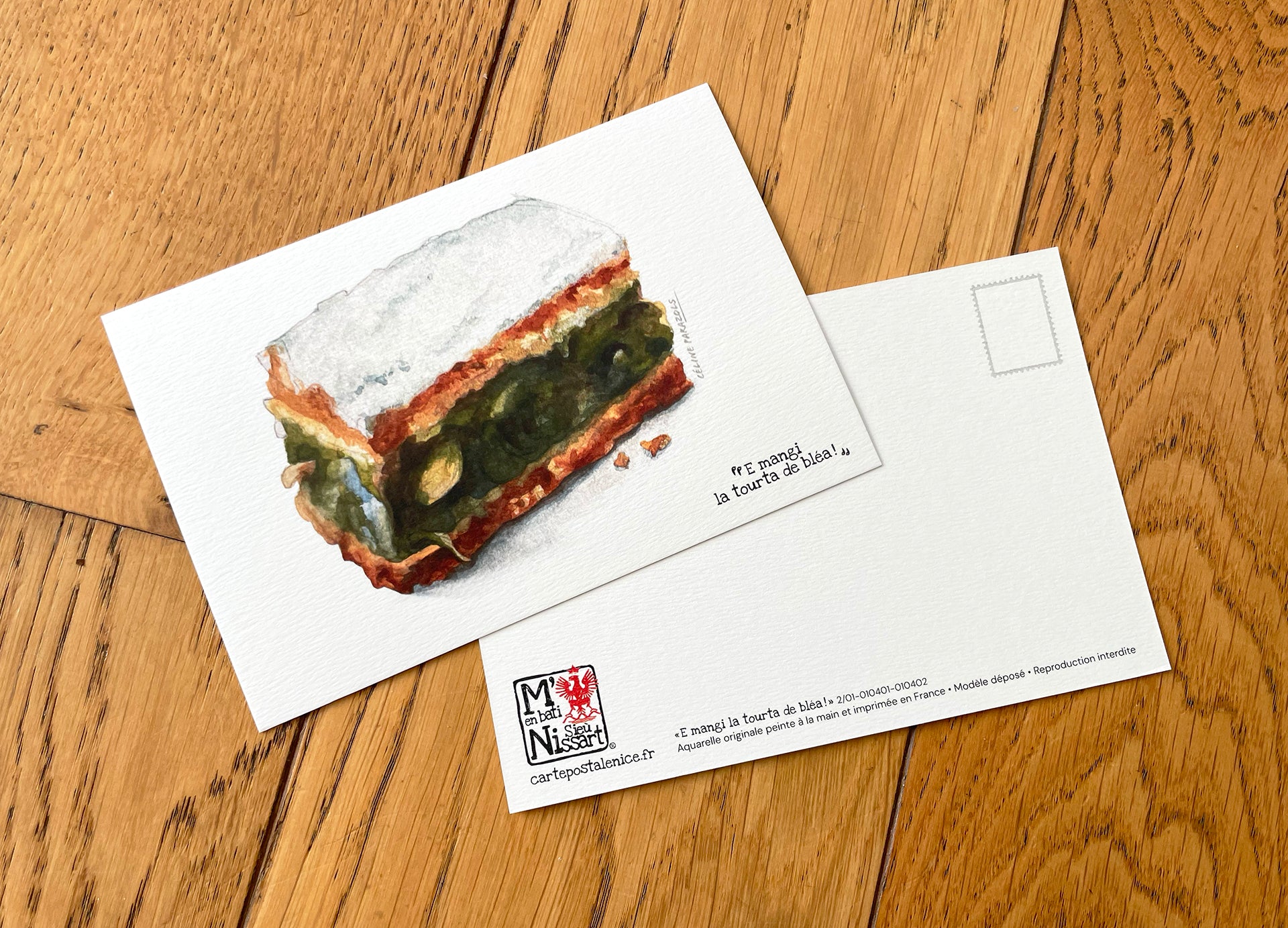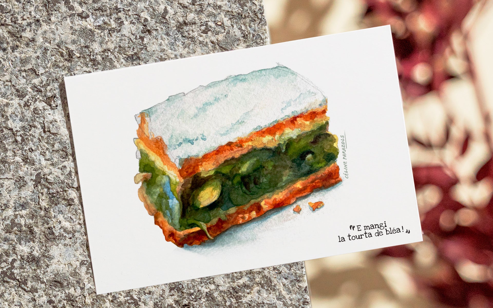 Carte postale d’art niçois, réalisée d’après une aquarelle originale. Imprimée en France à Nice sur papier rives blanc texturé au format 150 x 100 mm, 320 g. L’esprit “M’en Bati Sieù Nissart®”, marque déposée, à offrir ou encadrer.
