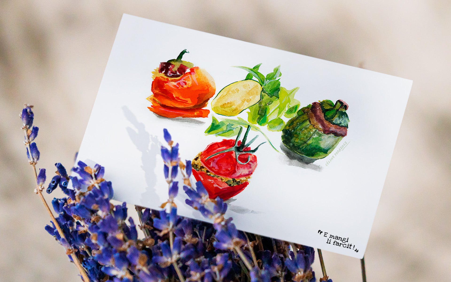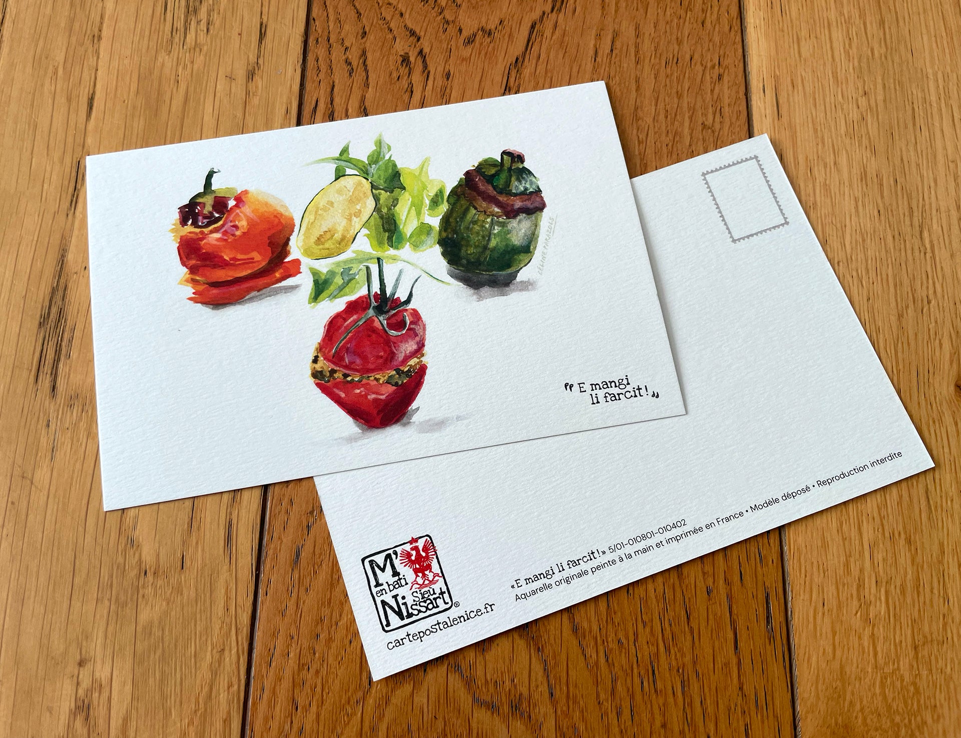 Carte postale d’art niçois, réalisée d’après une aquarelle originale. Imprimée en France à Nice sur papier rives blanc texturé. Formats rectangulaire 100 x 150 m, 320 g. L’esprit “M’en Bati Sieù Nissart®”, marque déposée, à offrir ou encadrer.
