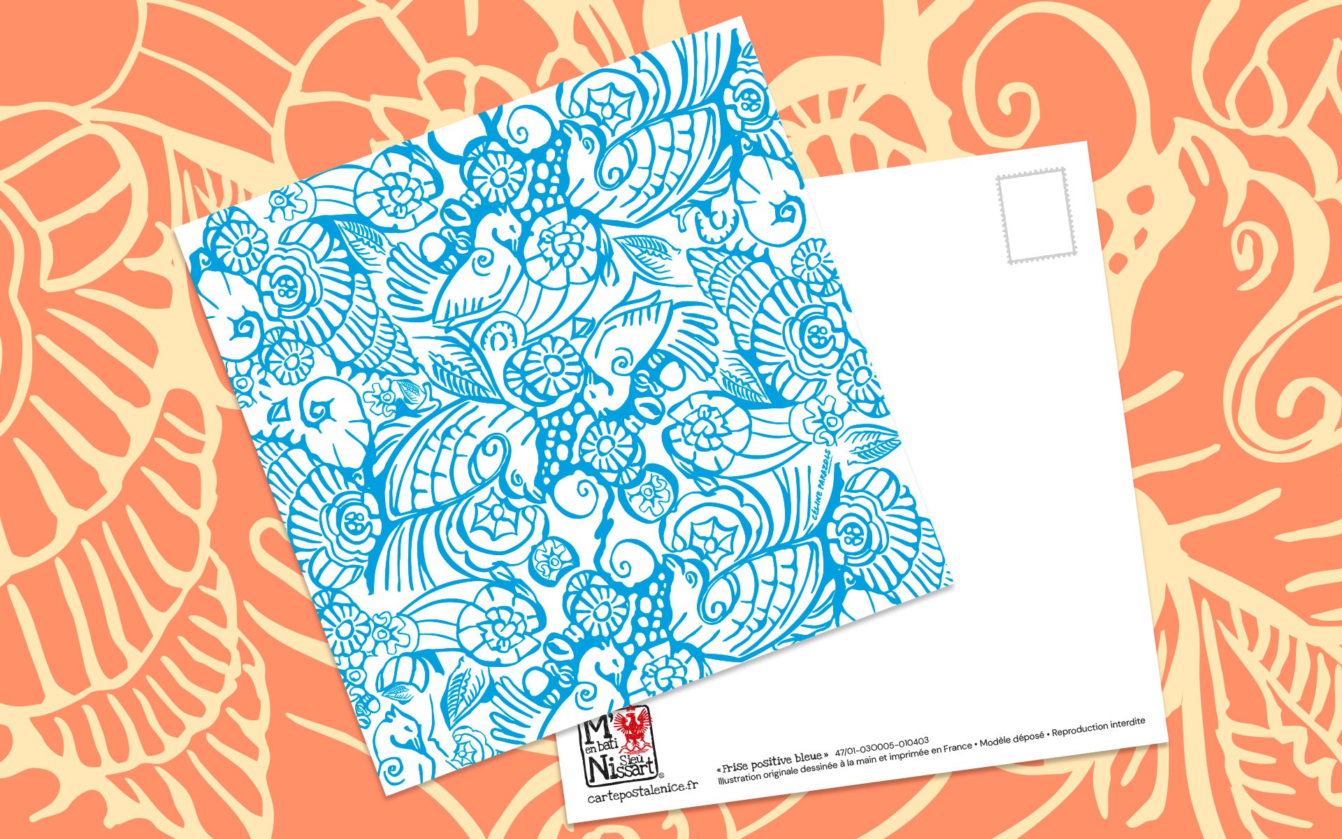 Carte postale d’art niçois — détails du patrimoine et quotidien — imprimée en France à Nice sur papier rives blanc texturé. Format carré 150 x 150 mm, 320 g. L’esprit “M’en Bati Sieù Nissart®”, marque déposée, à offrir ou encadrer.