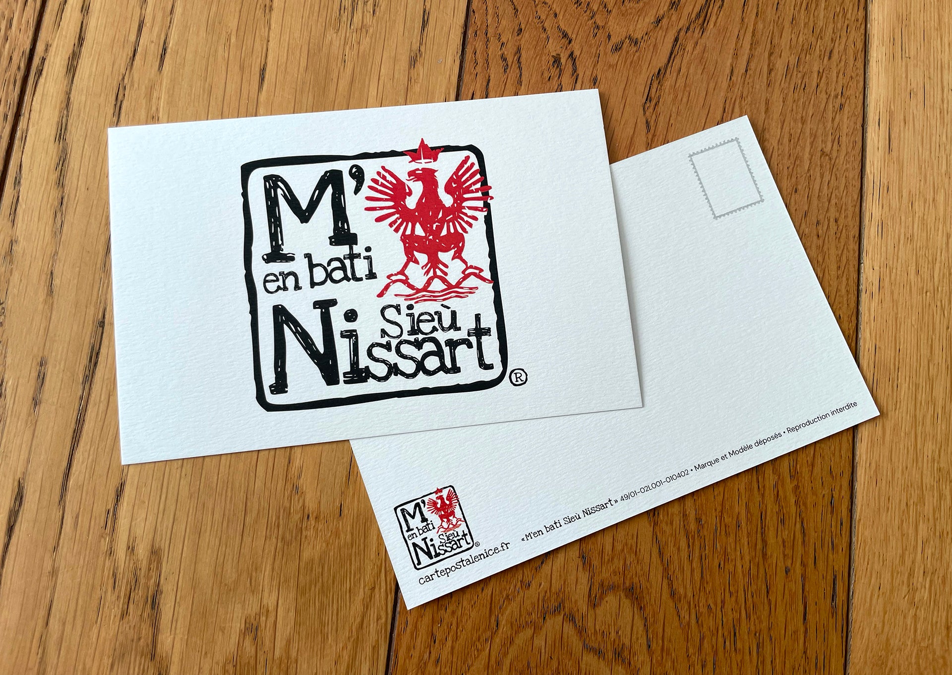 Carte postale logo de la marque — imprimée en France à Nice sur papier rives blanc texturé. Format 150 x 100 mm, 320 g. L’esprit “M’en Bati Sieù Nissart®”, marque déposée, à offrir ou encadrer.