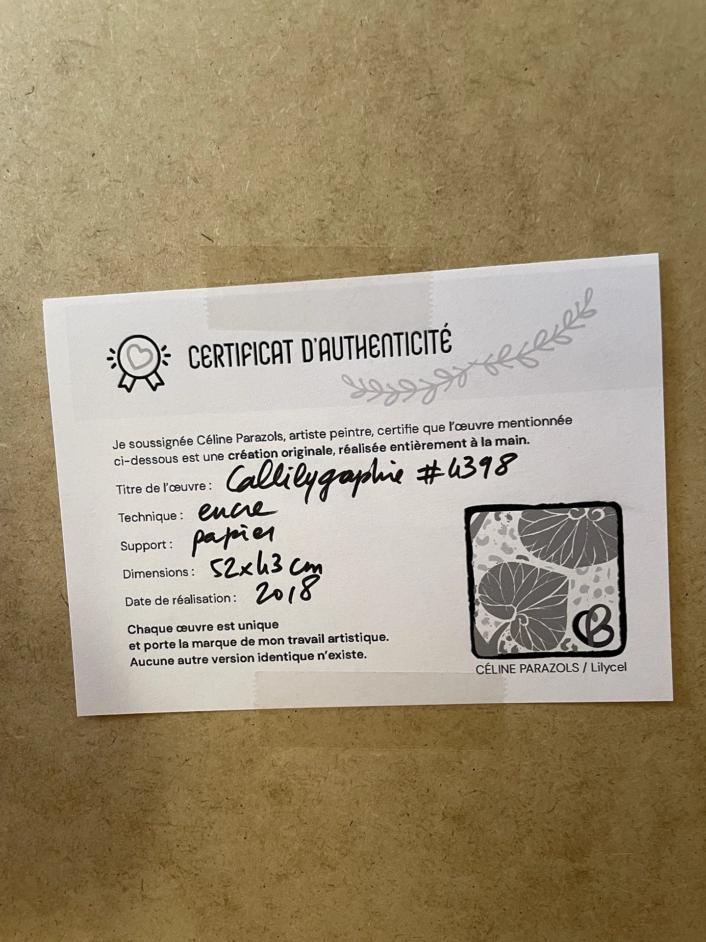 Œuvre originale unique. Peinte à la main, signée, fournie avec son certificat d’authenticité. Cette pièce existe en un seul exemplaire.