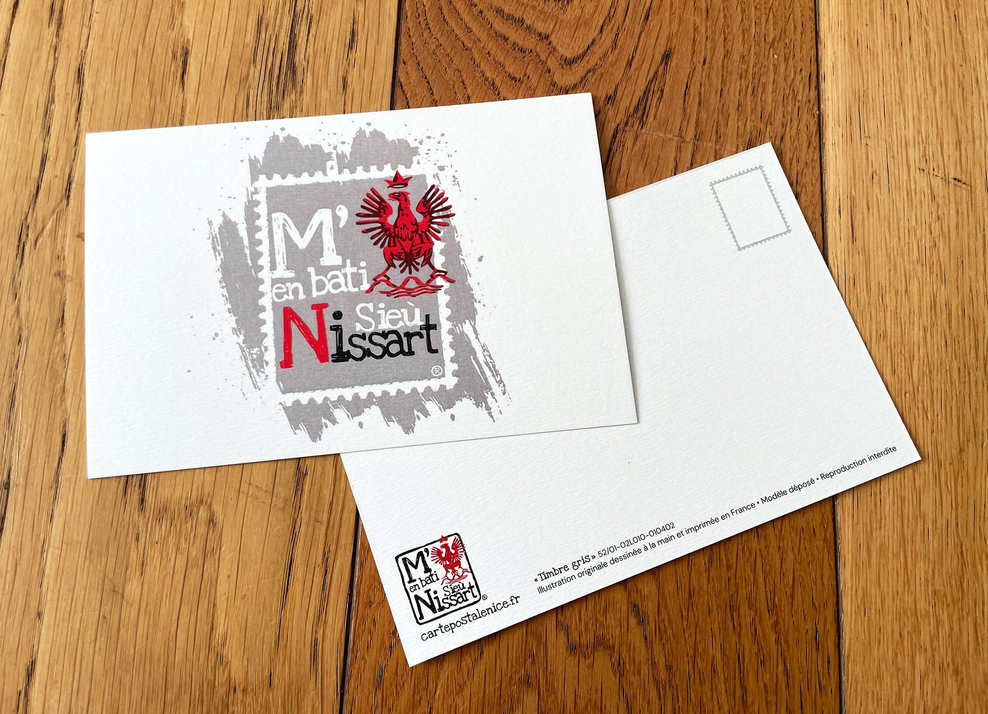 Carte postale imprimée en France à Nice sur papier rives blanc texturé. Format 150 x 100 mm, 320 g. L’esprit “M’en Bati Sieù Nissart®”, marque déposée, à offrir ou encadrer.