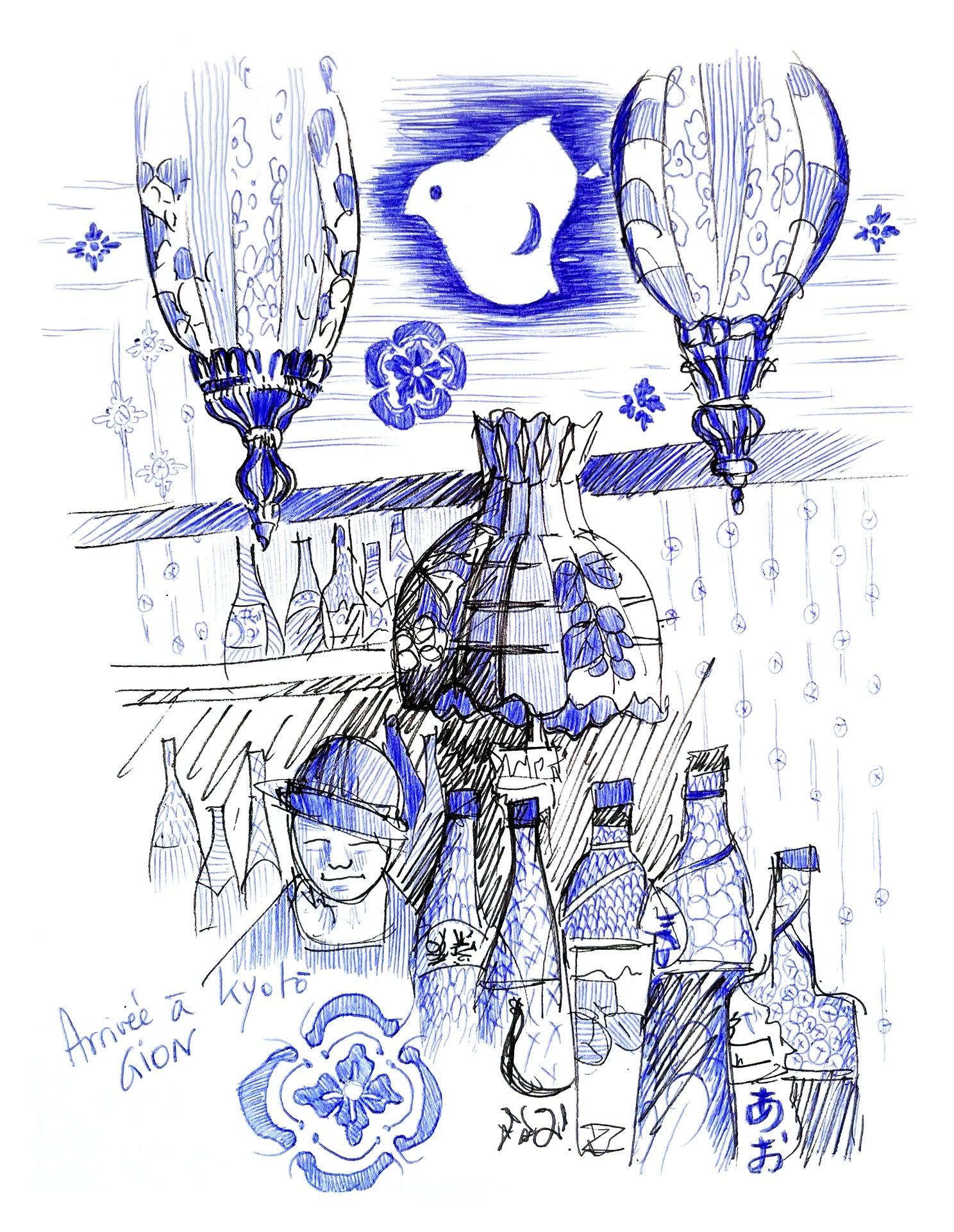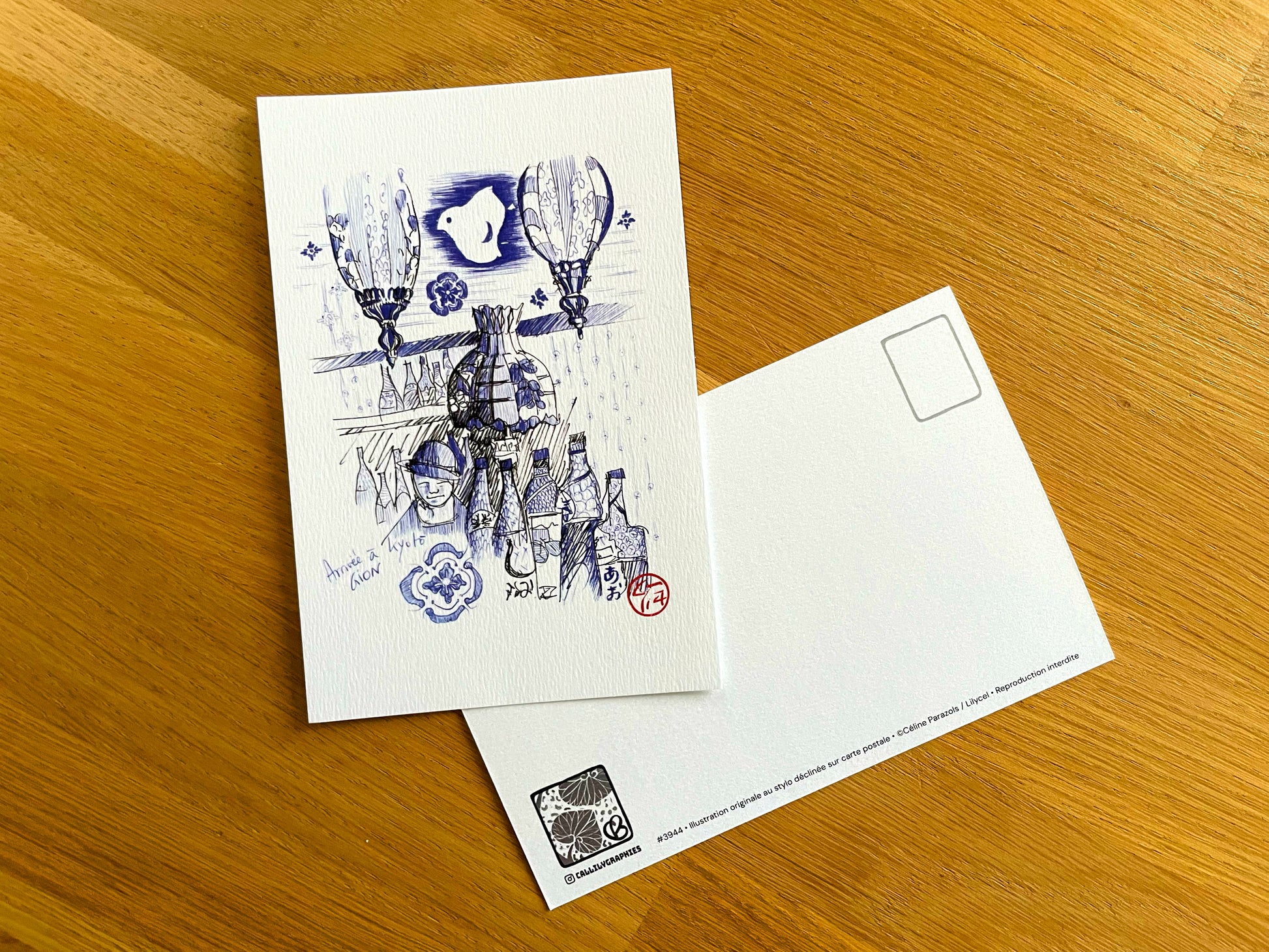 Carte postale d’art, carnet de voyage au japon les Callilygraphies™, d’après dessin au stylo bille. Calligraphie imprimée en France à Nice sur papier rives blanc texturé au format 100 x 150 mm, 250 g. Une collection poétique à offrir ou encadrer.