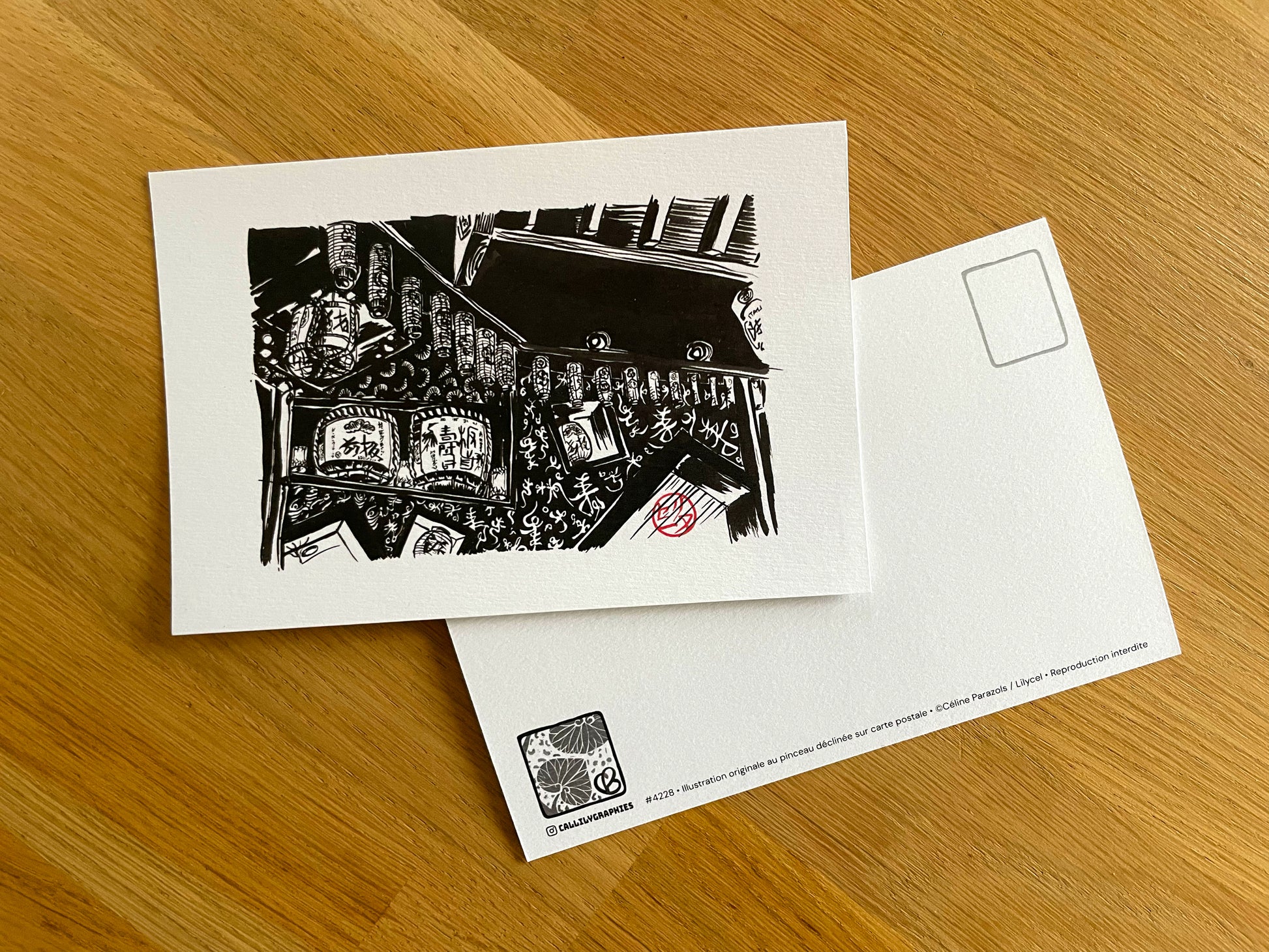 Carte postale imprimée en France à Nice sur papier rives blanc texturé au format 100 x 150 mm, 250 g. Esprit calligraphies d’un carnet de voyage au Japon. Une collection poétique à offrir ou à encadrer.
